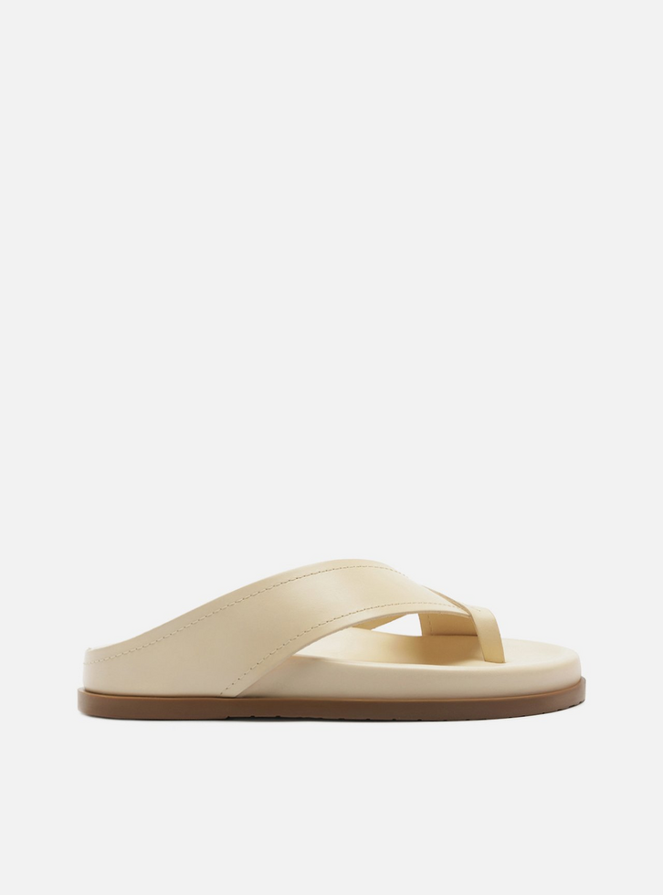 Sandália rasteira feminina off white de couro. O sapato tem palmilha com formato anatômico e inscrição do nome da marca. Possui solado flatform, base emborrachada e formato arredondado na ponta. Traz tiras largas em couro que partem da parte superior do pé até o calcanhar, cruzam na parte frontal e dividem os dedos.