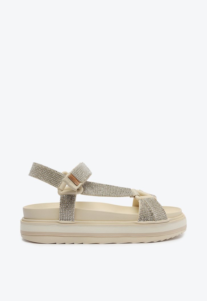 Sandália papete Anacapri branca. O modelo tem solado flatform e base emborrachada tratorada. Aberta, apresenta tiras por todo cabedal, com aplicação de manta brilhosa em strass, que se unem por tira ajustável com fecho em velcro no contorno do tornozelo. Com tira sobre os dedos, na lateral e peito do pé e ainda em torno do calcanhar, todas conectadas por elos em resina de mesmo tom da papete. Traz palmilha anatômica confortável com assinatura Anacapri.