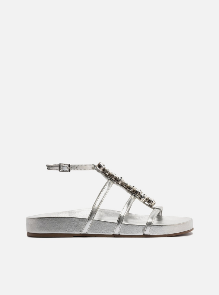 Sandália rasteira feminina prata de couro. O sapato tem palmilha lisa com formato anatômico e gravação do nome da marca. Possui solado flatform, base emborrachada e formato arredondado na ponta. Traz tiras finas no cabedal, sobre os dedos e a parte superior do pé, sendo uma central com pedrarias e as demais horizontais, todas conectadas. Possui tira em torno do tornozelo, fechando em fivela lateral.
