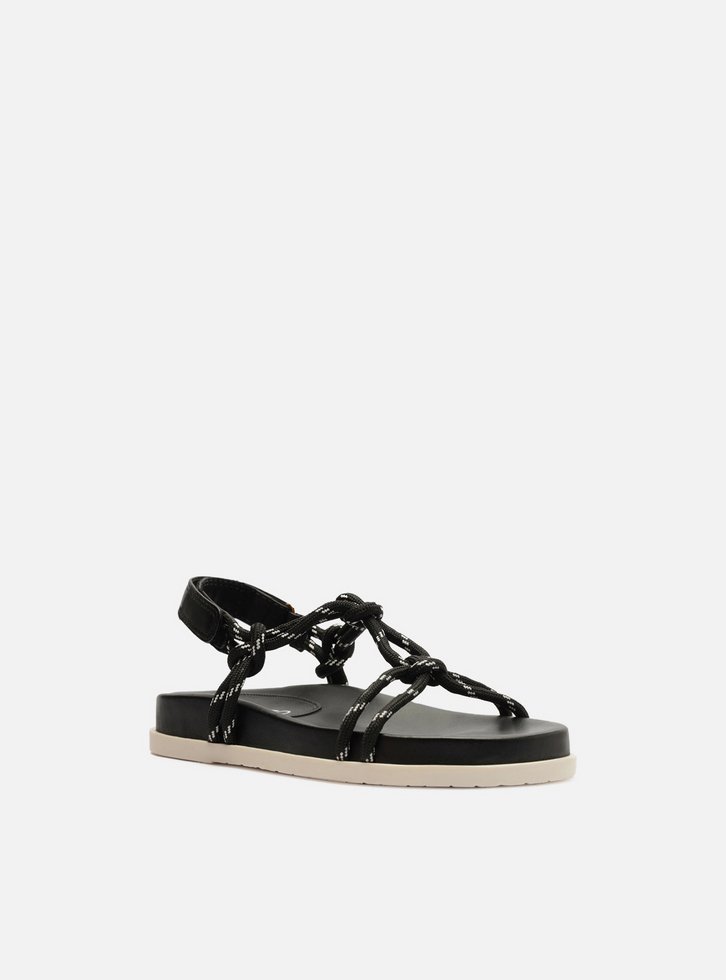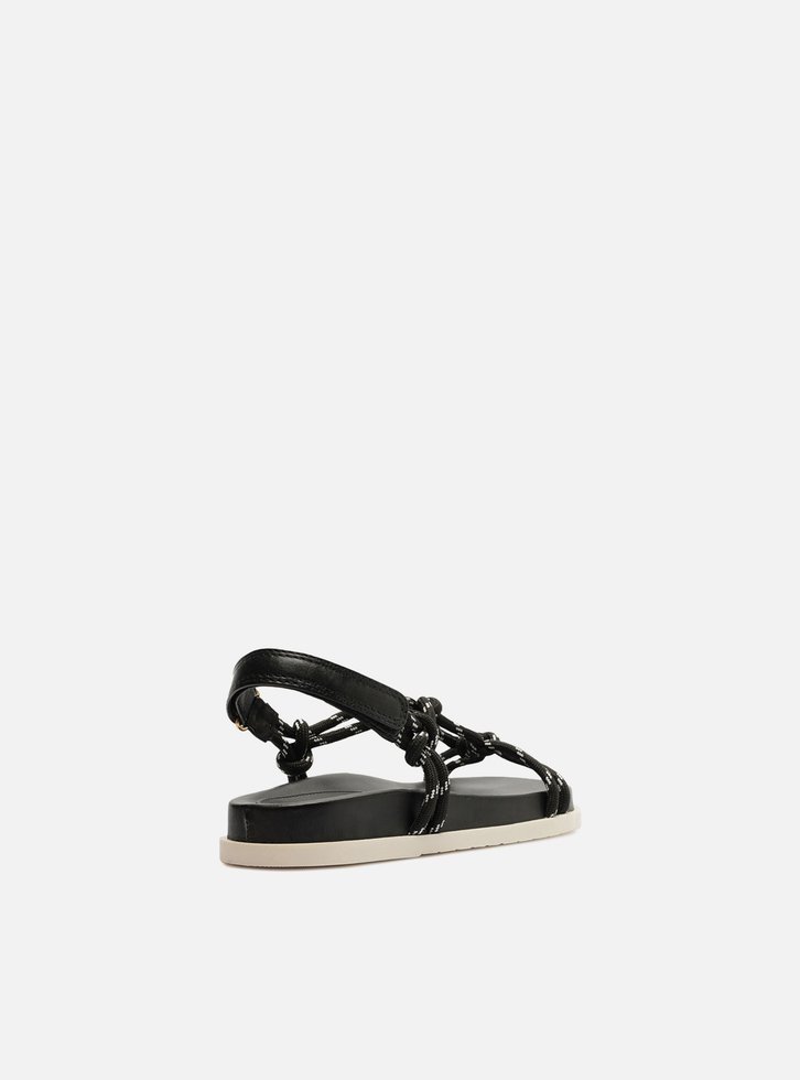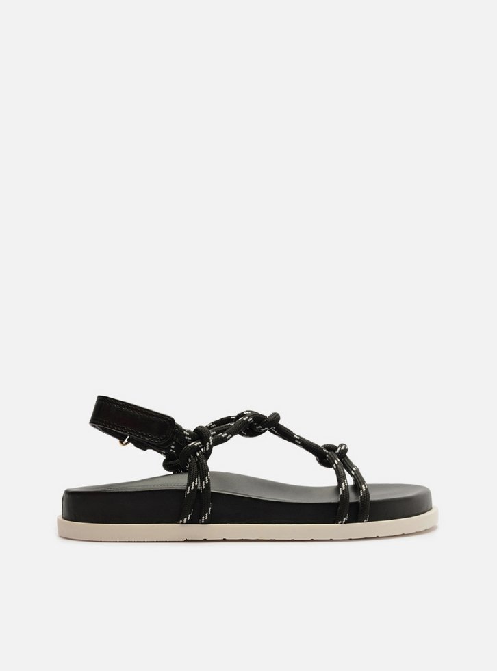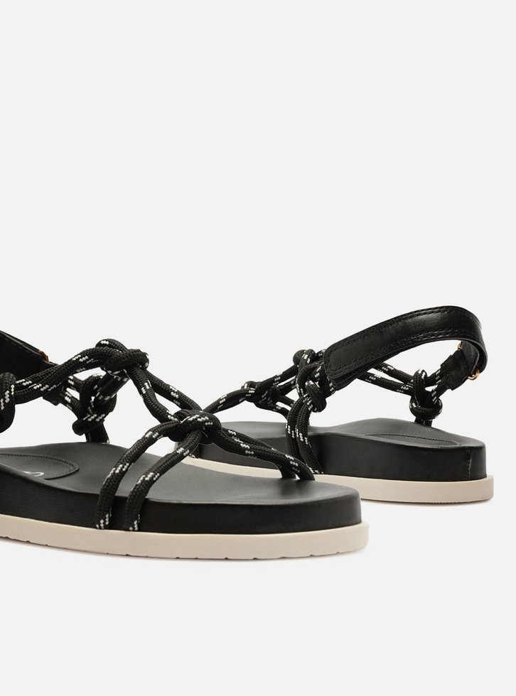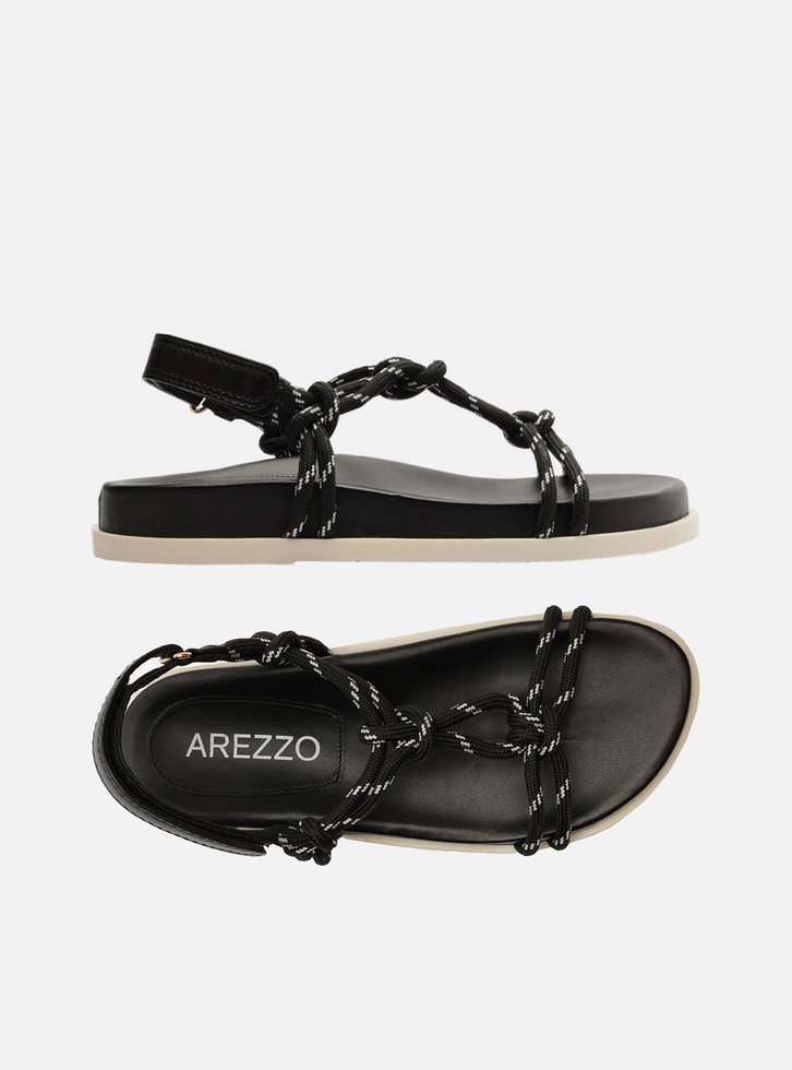 Sandália papete feminina preta em couro. O sapato tem salto rasteiro, palmilha com formato anatômico e inscrição do nome da marca. Possui solado flatform, base emborrachada branca e formato arredondado na ponta. Traz tiras em cordão, que passam sobre os dedos e na parte superior do pé, unidas por tira central com nós e nós nas laterais, conectadas ainda a tira de couro marrom no calcanhar e fechando em velcro. Acompanha um conjunto com duas tornozeleiras em cordão colorido, uma delas trançada e com pingente metálico e a outra lisa.