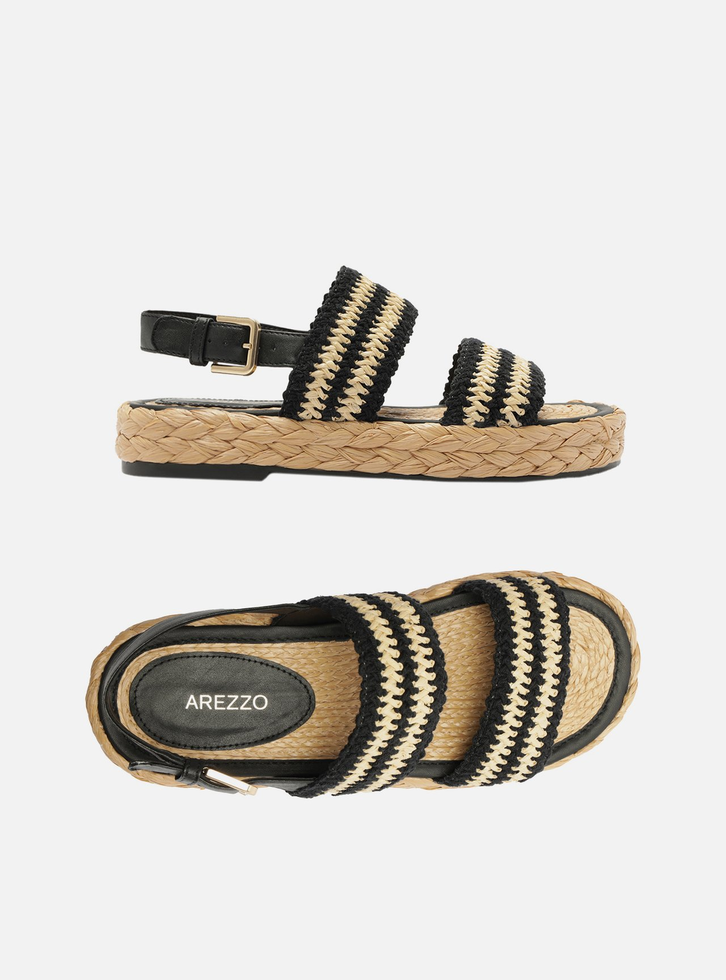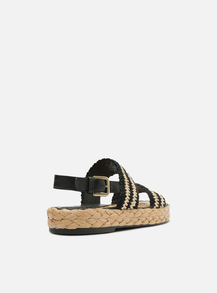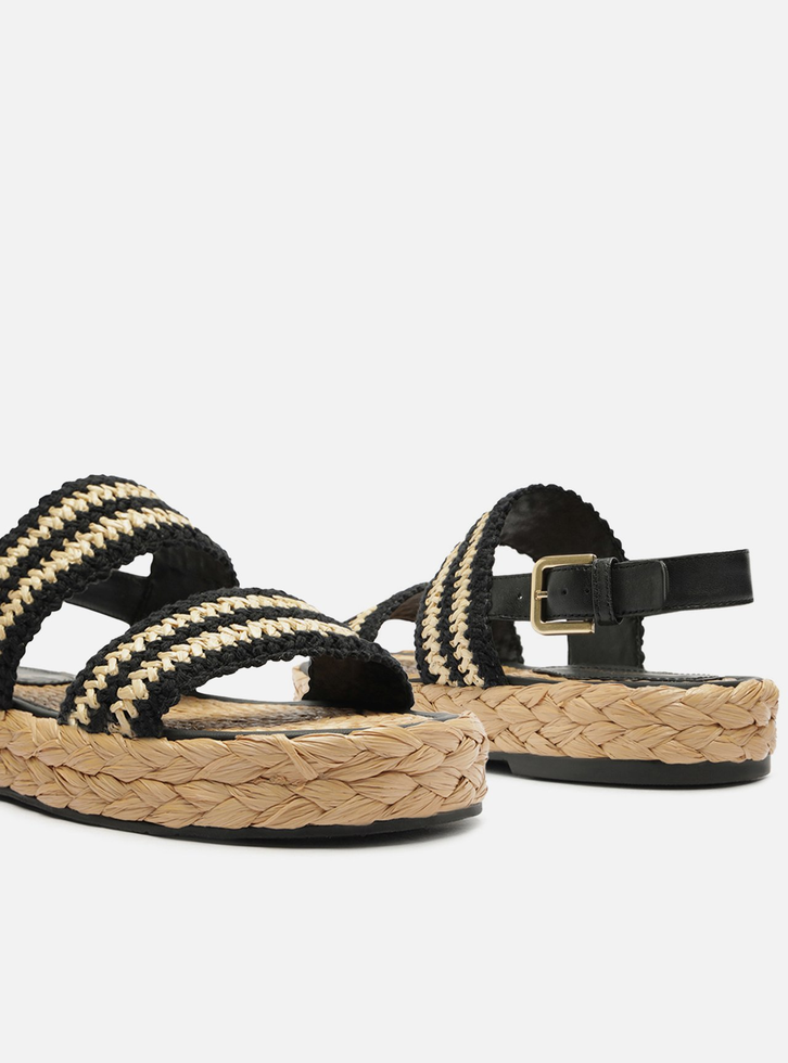 Sandália papete preta e natural. O modelo tem salto baixo, palmilha em corda natural e calcanheira preta com nome da marca. Possui solado flatform revestido em corda trançada e bico redondo. Traz tiras largas tramadas sobre os dedos e o peito do pé. Com tira preta em torno do calcanhar e fecho em fivela quadrada lateral.