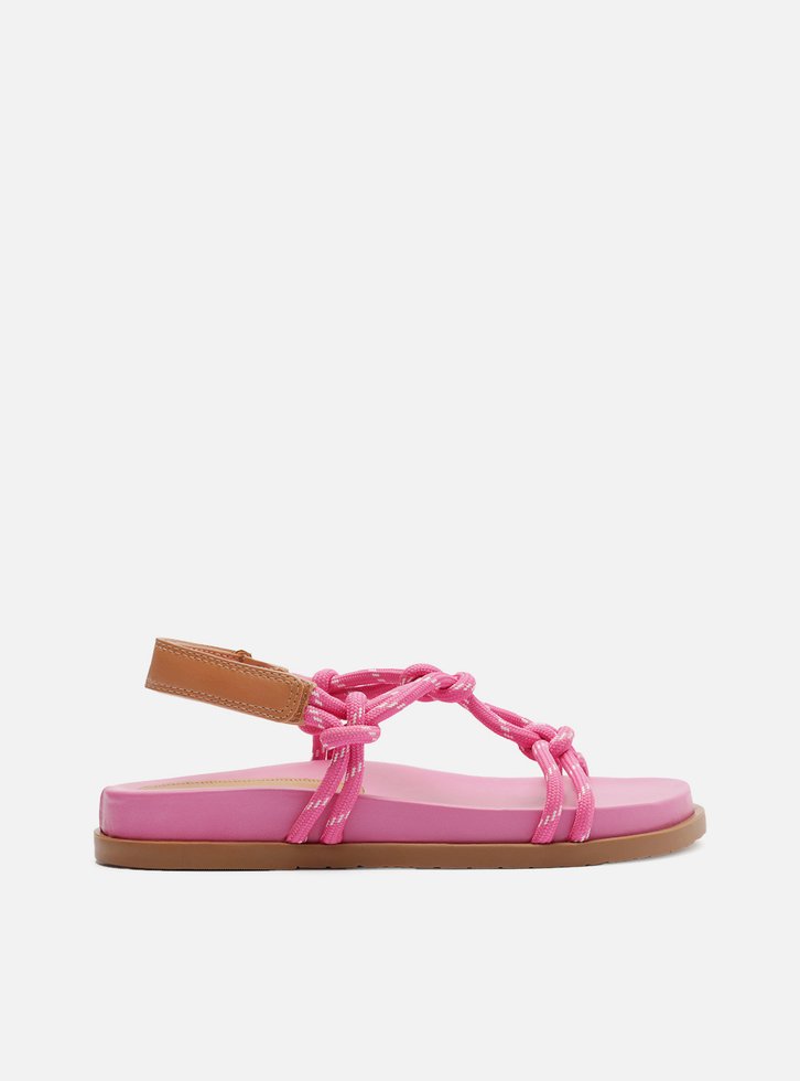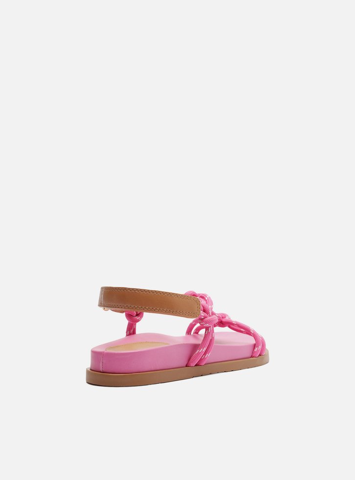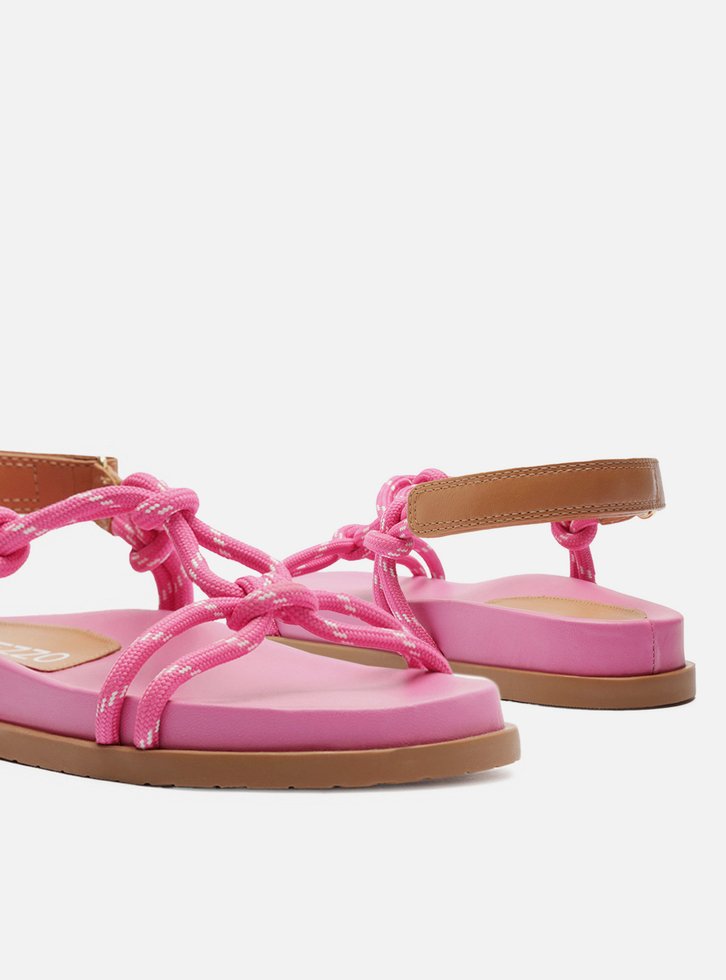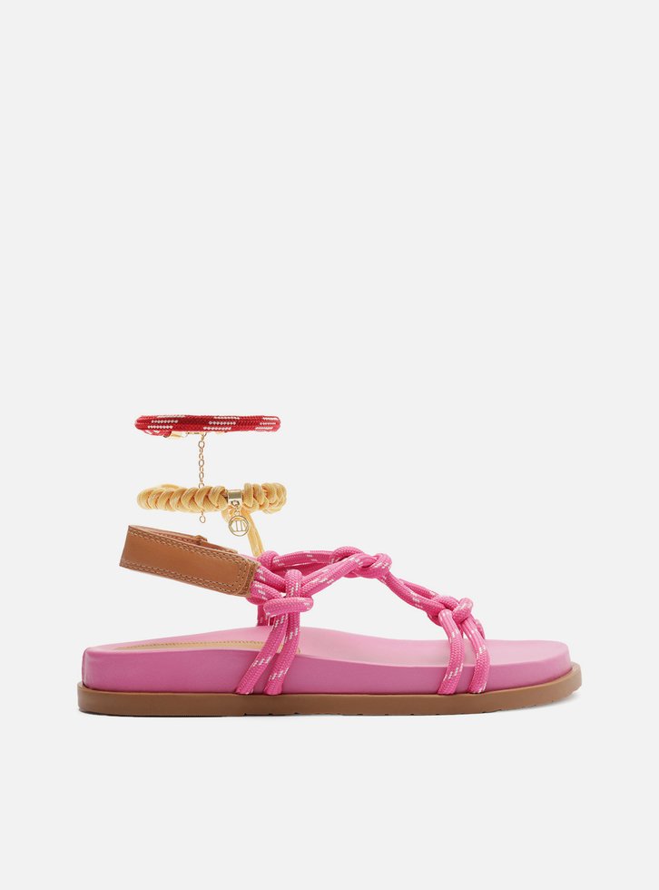 Sandália papete feminina rosa em couro. O sapato tem salto rasteiro, palmilha com formato anatômico e inscrição do nome da marca. Possui solado flatform, base emborrachada e formato arredondado na ponta. Traz tiras em cordão, que passam sobre os dedos e na parte superior do pé, unidas por tira central com nós e nós nas laterais, conectadas ainda a tira de couro marrom no calcanhar e fechando em velcro. Acompanha um conjunto com duas tornozeleiras em cordão colorido, uma delas trançada e com pingente metálico e a outra lisa.