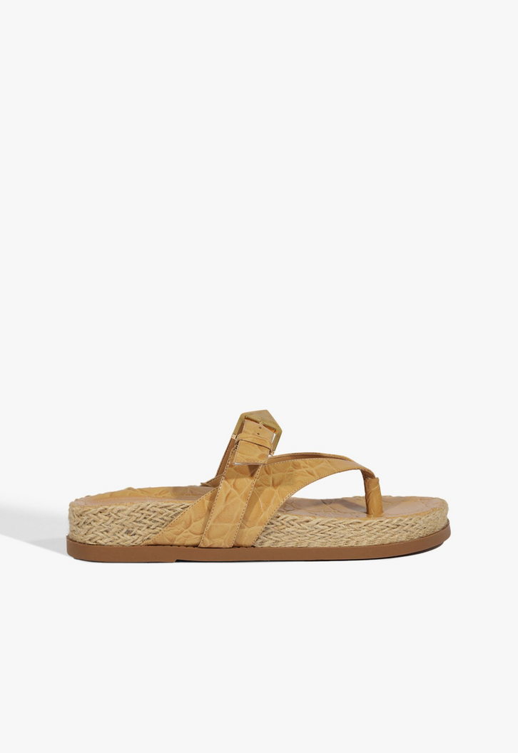 Papete em couro croco, com cabedal em V e tira horizontal sobre o peito do pé, adornada com fivela decorativa. Sola com detalhe em ráfia ao redor.