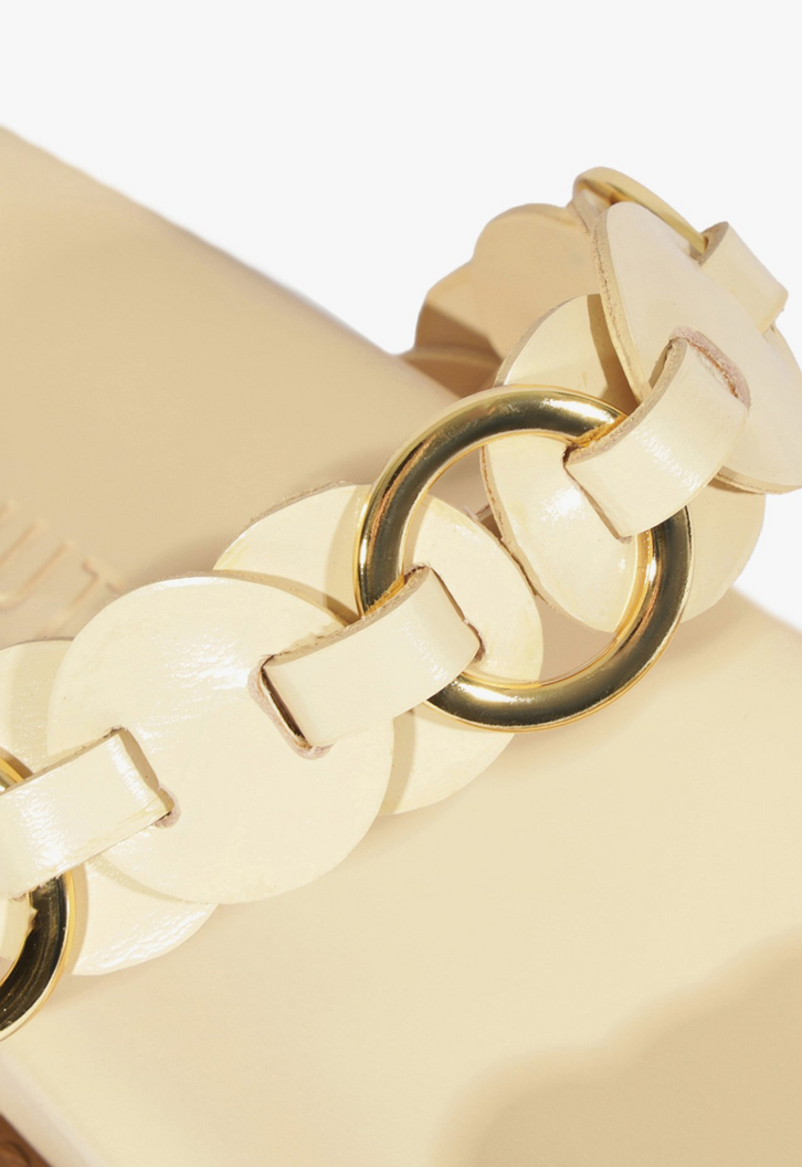 Cheia de atitude, esta sandália papete branca em couro é a escolha ideal para quem busca estilo com conforto. Com duas tiras largas no cabedal adornadas por argolas douradas, o modelo slide ganha um visual moderno e marcante que deixa qualquer look mais interessante. A palmilha anatômica garante conforto extra, perfeita para elevar looks casuais ou dar um toque cool às produções clássicas. Aposte!