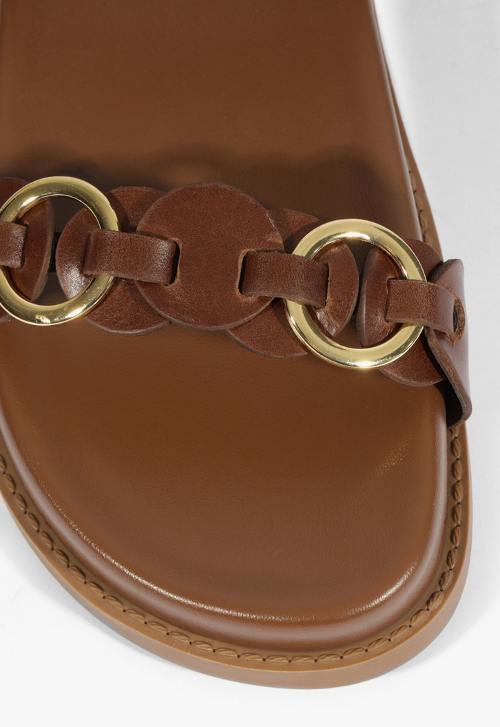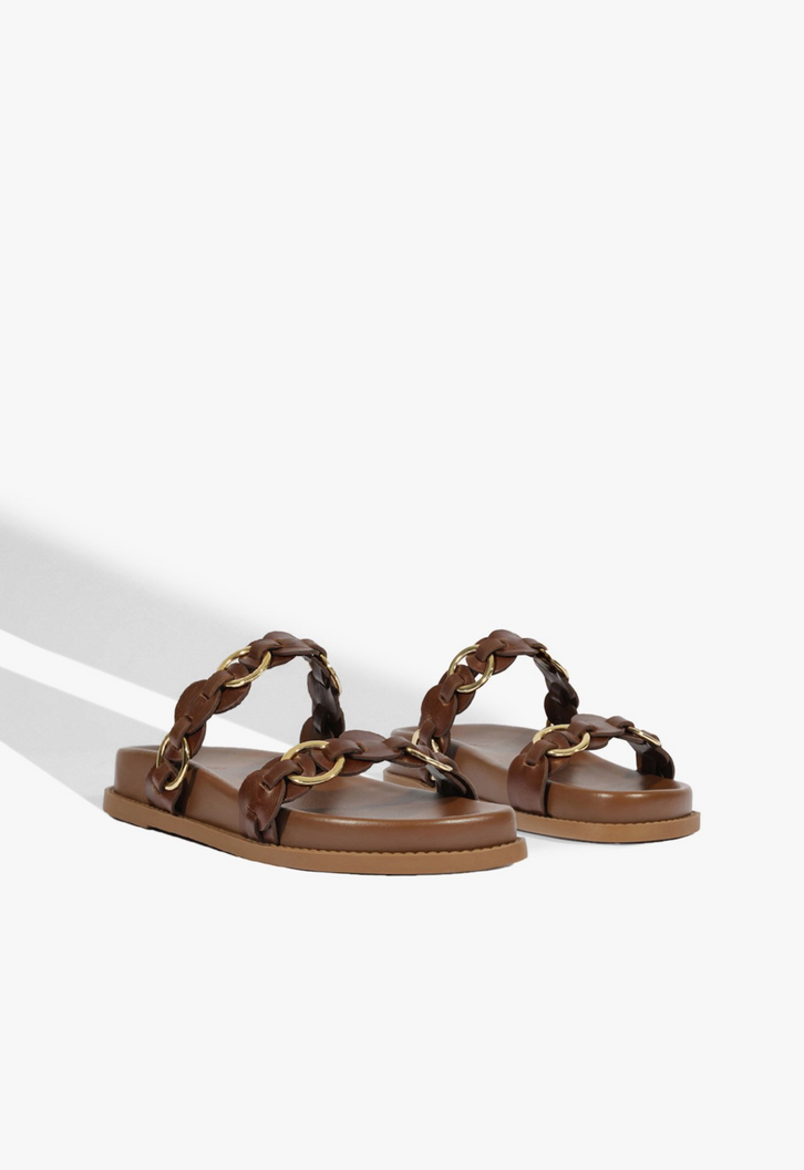 Cheia de atitude, esta sandália papete branca em couro é a escolha ideal para quem busca estilo com conforto. Com duas tiras largas no cabedal adornadas por argolas douradas, o modelo slide ganha um visual moderno e marcante que deixa qualquer look mais interessante. A palmilha anatômica garante conforto extra, perfeita para elevar looks casuais ou dar um toque cool às produções clássicas. Aposte!