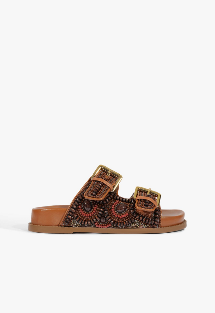 Com visual marcante e artesanal, esta sandália papete marrom em couro se destaca pelo cabedal ricamente bordado em miçangas, adicionando textura e personalidade ao visual. As duas tiras grossas com fivelas douradas completam o design desse slide com um toque extra de atitude, tornando o modelo perfeito para elevar produções casuais com estilo e conforto de sobra. Aposte!