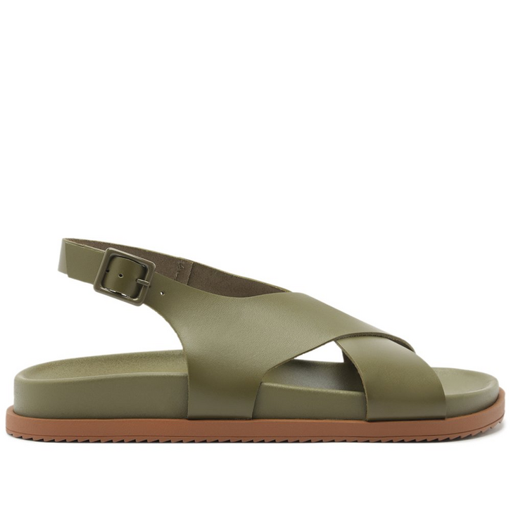 Papete de tiras cruzadas, na cor verde. O modelo de material similar ao couro traz biqueira arredondada. Possui cabedal com tiras mais largas na gáspea, que se cruzam sobre os dedos e peito de pé - seguindo até a pala e abraçando o tornozelo - contornando o calcanhar, com fecho afivelado na lateral. Apresenta solado rasteiro emborrachado e tratorado, com palmilha anatômica da mesma cor da papete, com assinatura Anacapri.