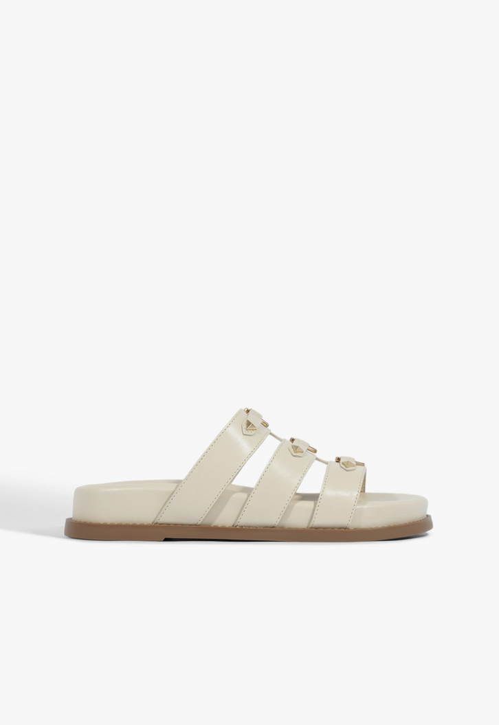 Apresentamos a papete Tricia, a prova de que o conforto pode ter muita personalidade. Ela combina a praticidade do design slide e a tendência robusta das papetes com o charme edgy das tachas metálicas, tudo em um tom de branco rico e elegante.