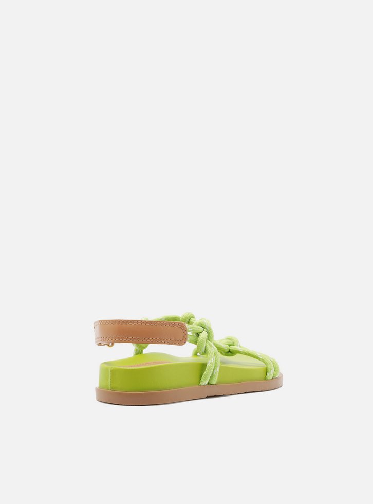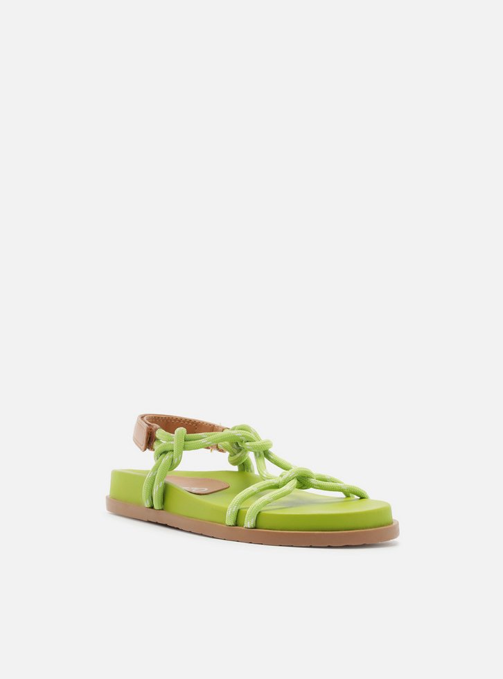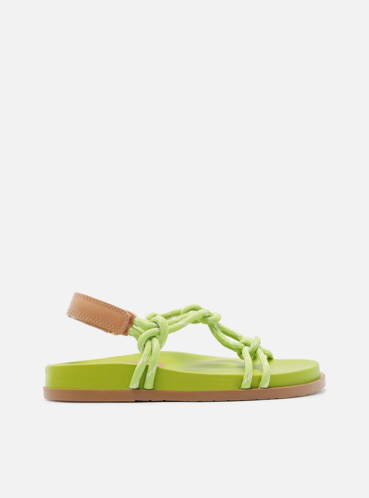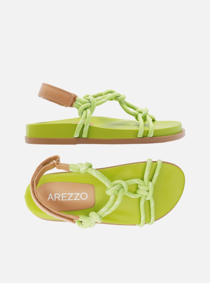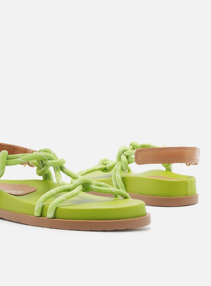Sandália papete feminina verde em couro. O sapato tem salto rasteiro, palmilha com formato anatômico e inscrição do nome da marca. Possui solado flatform, base emborrachada e formato arredondado na ponta. Traz tiras em cordão, que passam sobre os dedos e na parte superior do pé, unidas por tira central com nós e nós nas laterais, conectadas ainda a tira de couro marrom no calcanhar e fechando em velcro. Acompanha um conjunto com duas tornozeleiras em cordão colorido, uma delas trançada e com pingente metálico e a outra lisa.