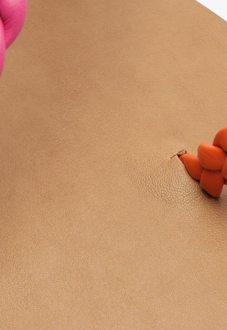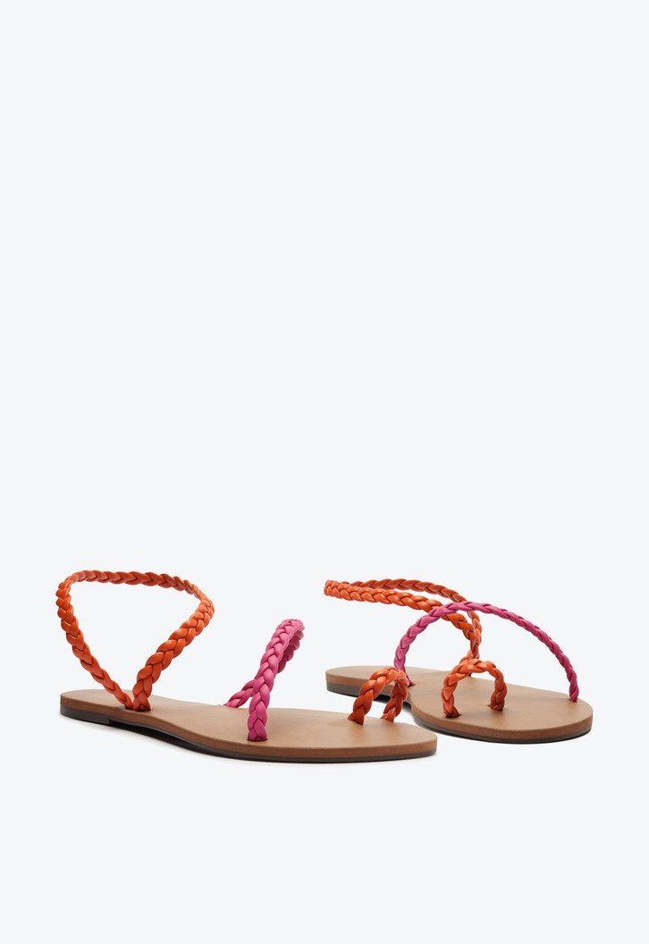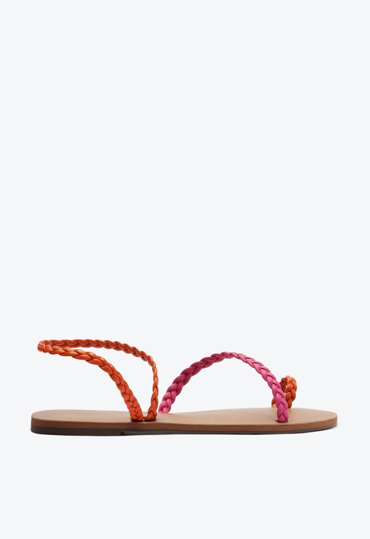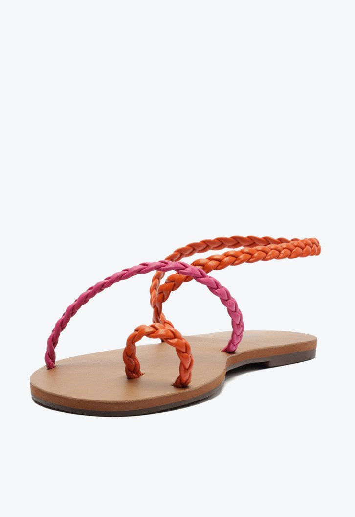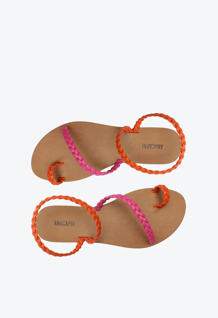 Sandália Tira Trançada De Encaixe Pink e Laranja. De material similar ao couro e biqueira arredondada, possui solado emborrachado com leve saltinho. O modelo traz cabedal com trio de tirinhas trançadas: uma sobre o dedão, outra que perpassa em curva no peito de pé presa na lateral e uma tira traseira elástica em meia cana transversal - que passa pelo tornozelo, contornando o calcanhar pela lateral, facilitando o calce de encaixe. Traz palmilha marrom, com assinatura Anacapri.