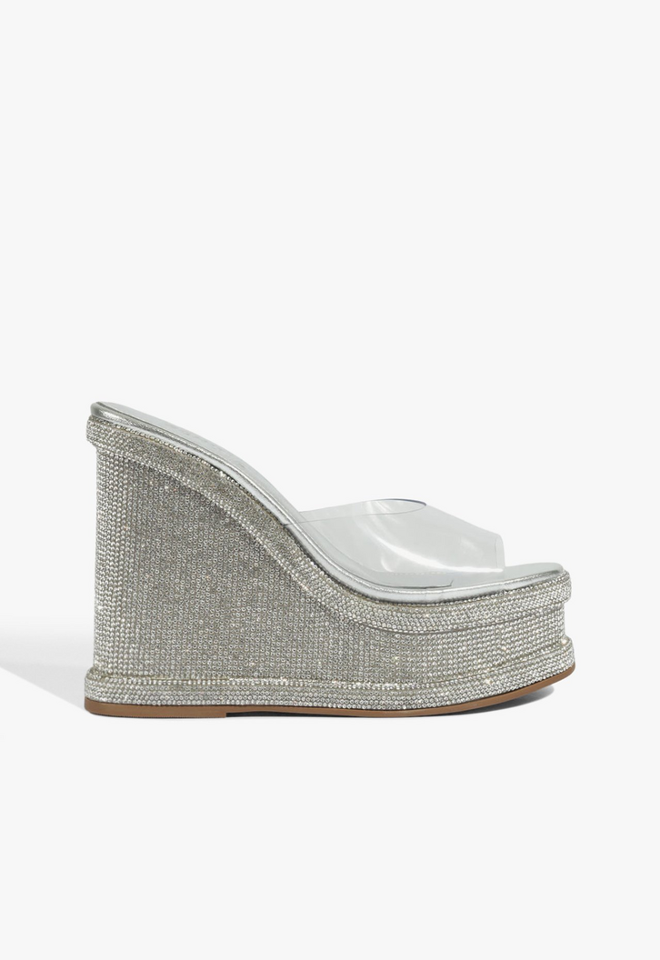 Prepare-se para brilhar com o modelo mais ousado e fashionista da coleção. Esta plataforma combina a tendência do vinil transparente com um salto anabela inteiramente revestido em glitter premium, criando um efeito visual de pernas alongadas e sofisticação máxima.