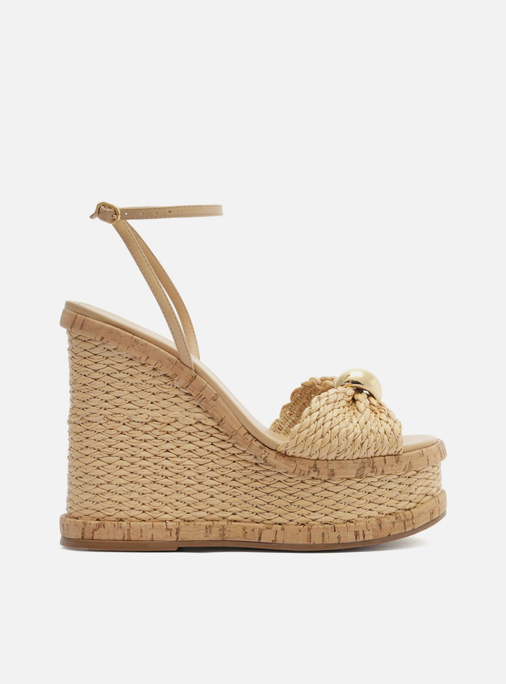 Sandália bege em palha. O sapato tem salto alto plataforma e anabela, revestido em palha tramada e com contorno superior e inferior em cortiça, além de formato quadrado na ponta. Traz tira larga sobre os dedos em palha tramada e com detalhe em metal dourado, espesso e orgânico preso no centro. Possui tira fina que sai das laterais, cruza no calcanhar, contorna o tornozelo e fecha em fivela lateral. Com palmilha bege e inscrição do nome da marca.