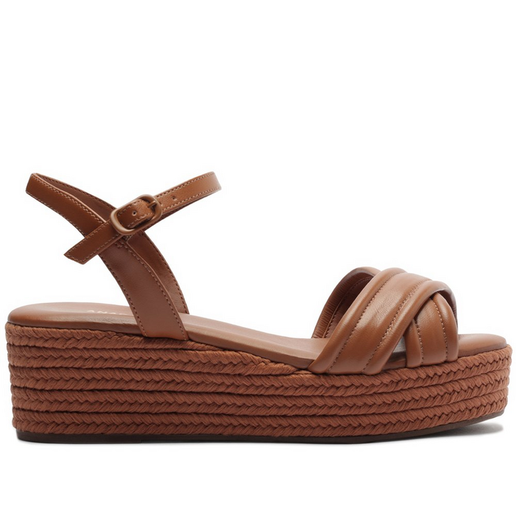 Sandália plataforma em corda com detalhe em pespontos, na cor marrom. O modelo possui cabedal com duas tiras grossas de material similar ao couro stretch, contornadas em pesponto de mesmo tom - que se cruzam sobre os dedos. Com salto flatform, apresenta solado revestido em palha natural trançada. Possui fechamento superior em tira fina afivelada regulável no tornozelo, que se conecta na tira que contorna o calcanhar. De biqueira arredondada, traz palmilha acolchoada marrom, com assinatura Anacapri.