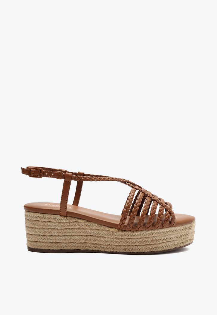 Sandália plataforma marrom. O modelo possui solado flatform alto revestido em corda natural trançada e bico redondo. Traz cabedal vazado com seis tiras fininhas e trançadas sobre os dedos, unidas por duas tiras laterais que se cruzam sobre os dedos, presas nas laterais e sobem até o peito do pé contornando o calcanhar, com fecho em fivela metálica lateral. Com palmilha acolchoada de mesmo tom da sandália com assinatura Anacapri.