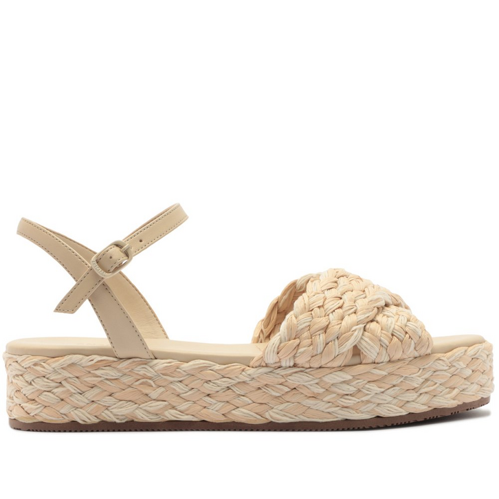 Sandália Plataforma Anacapri em palha trançada branca. O modelo possui solado plataforma em corda trançada e bico redondo. Apresenta duas tiras médias em tecido tramado de palha trançada que se cruzam sobre os dedos. Apresenta fecho em fivela de resina lateral em tira que contorna calcanhar e tornozelo. Com palmilha acolchoada nude e assinatura Anacapri.