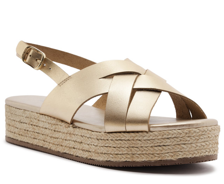 Sandália plataforma de tiras entrelaçadas e recortes vazados, na cor dourada. O modelo de biqueira arredondada - com design de recortes vazados - traz duas tiras mais largas, com detalhes de recortes vazados que se entrelaçam entre si. As tiras se cruzam em X sobre os dedos e o peito de pé. De material similar ao couro, apresenta tira traseira que contorna o calcanhar, com fecho lateral afivelado. De salto flatform, com solado revestido de palha natural trançada, traz palmilha acolchoada no mesmo tom da sandália, com assinatura Anacapri. A sandália deixa parte dos dedos e laterais à mostra.
