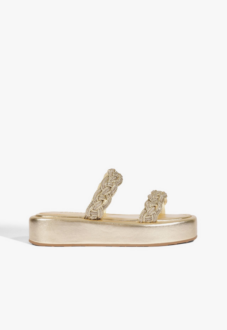 Com design marcante e toque sofisticado, esta sandália plataforma aposta em tiras trançadas com acabamento dourado, garantindo brilho na medida certa. A plataforma proporciona conforto e estabilidade, tornando o modelo ideal para produções do dia a dia ou looks de verão mais elaborados. Versátil e moderna, é a escolha certa para quem busca estilo sem abrir mão do conforto.