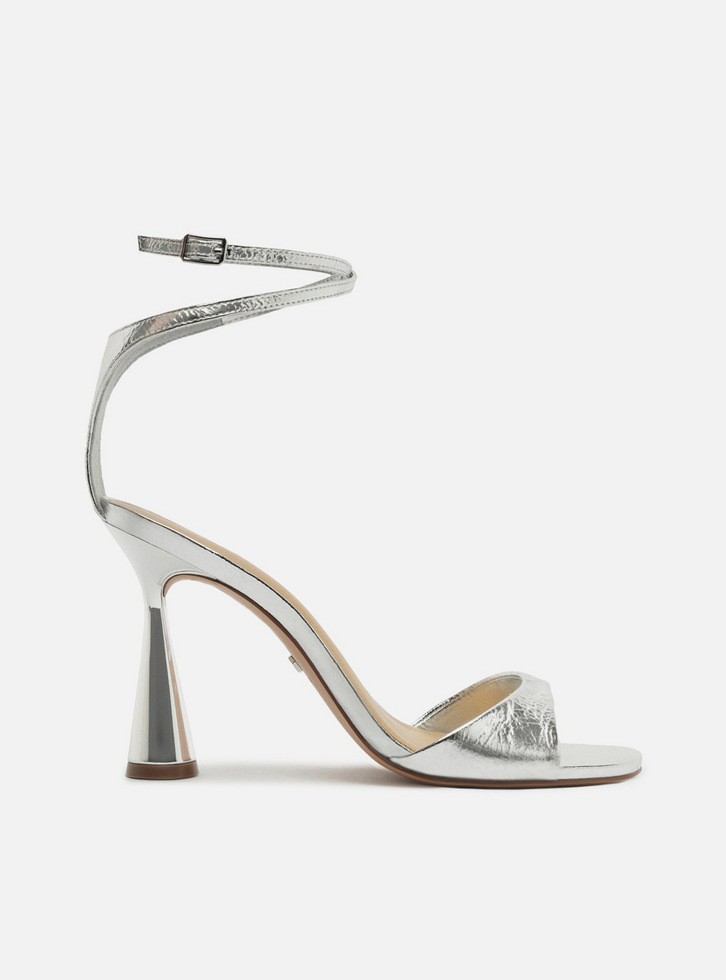 Sandália prata de couro. O sapato tem salto alto metalizado em formato taça e formato quadrado na ponta. Traz tira sobre os dedos, mais larga nas laterais, e é semi coberta no calcanhar. Possui tiras finas que cruzam na parte frontal, contornam o tornozelo e fecham em fivela lateral. Com palmilha bege e inscrição do nome da marca.
