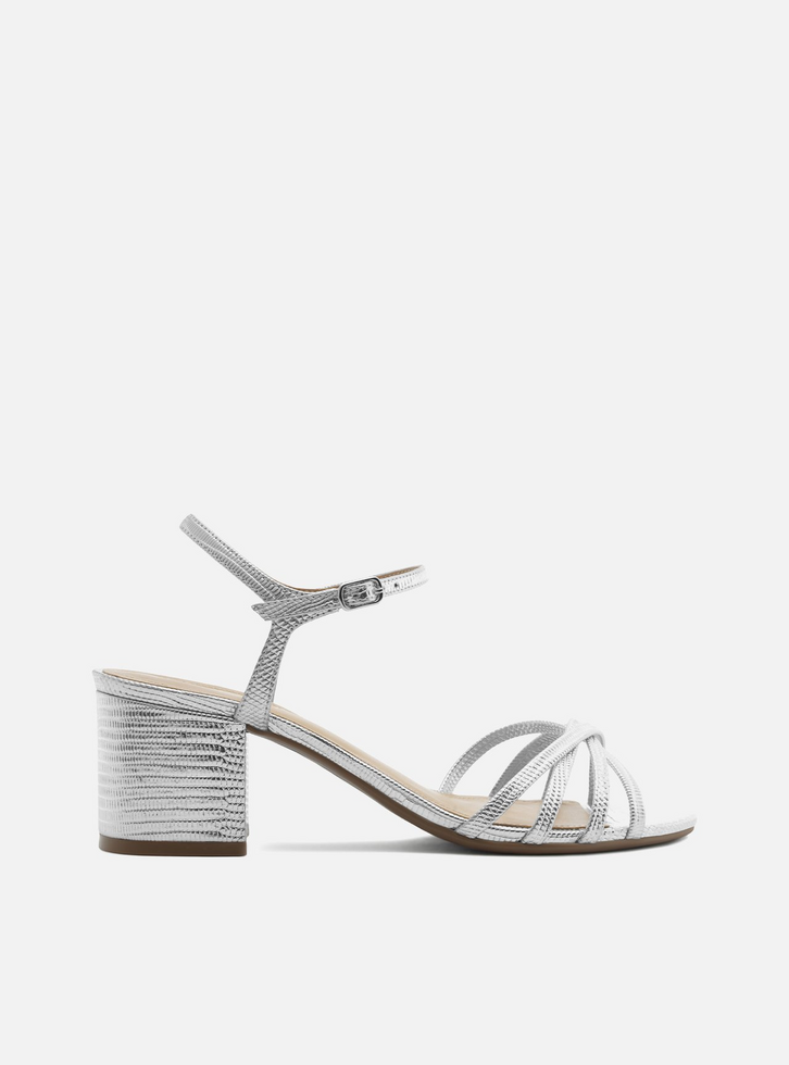 Sandália feminina prata em material com textura lizard. O sapato tem salto médio bloco e formato arredondado na ponta. Traz tiras finas e metalizadas sobre os dedos, além de tira fina no tornozelo com fivela lateral ajustável. Com palmilha bege e inscrição do nome da marca.