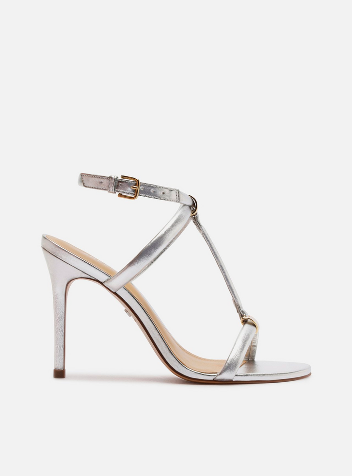 Sandália feminina prata. O sapato tem salto alto fino e formato arredondado na ponta. Traz tira sobre os dedos e tira vertical na parte superior do pé, que vai até o tornozelo e se conecta a outras duas tiras — uma delas contorna o tornozelo e fecha em fivela lateral. As tiras são levemente estofadas e conectadas por elos metálicos. Com palmilha bege e inscrição do nome da marca.