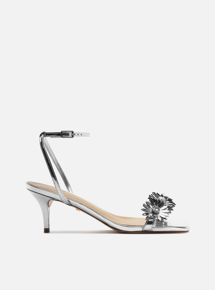 Sandália Prata Salto Baixo Flores