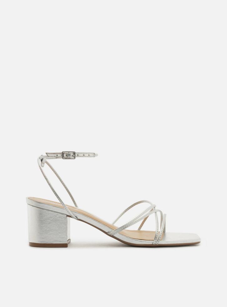Sandália feminina prata. O sapato tem salto médio bloco e formato quadrado na ponta. Traz tiras finas cruzadas sobre os dedos e a parte superior do pé. Possui tira no calcanhar conectada à tira fina no tornozelo, com fecho em fivela metálica lateral. Com palmilha bege e inscrição do nome da marca.