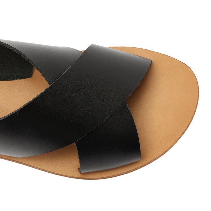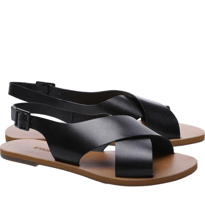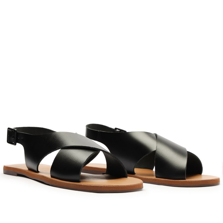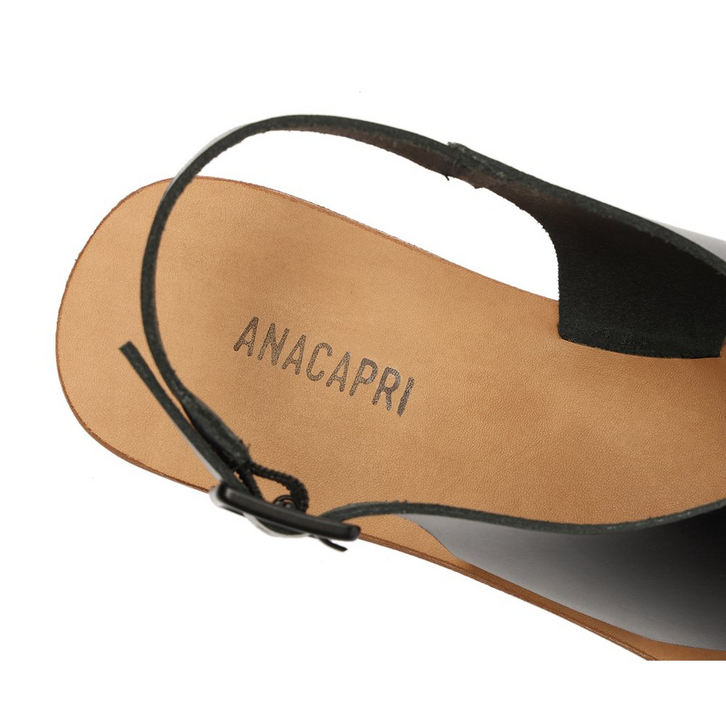 Rasteira monocolor de tiras cruzadas, na cor preta. O modelo de material similar ao couro, possui duas tiras mais largas na gáspea que se cruzam em design de X e seguem até a pala abraçando o tornozelo, com uma tira mais fina que contorna o calcanhar e fecho regulável por fivela quadrada - no mesmo tom da rasteirinha, pela lateral. Apresenta solado rasteiro emborrachado marrom, com leve saltinho traseiro e palmilha com assinatura Anacapri.