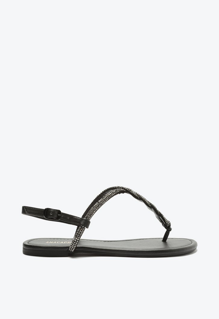 Sandália Slim Anacapri preta. O modelo de salto rasteiro com shape slim traz duas tiras torcidas sobre o peito do pé, com separador de dedos e aplicação de strass, que se prendem nas laterais. Com fecho em fivela lateral em tira que contorna o calcanhar. De bico redondo e acabamento metalizado, ela deixa todo o pé à mostra. Com palmilha de mesmo tom da sandália e assinatura Anacapri.