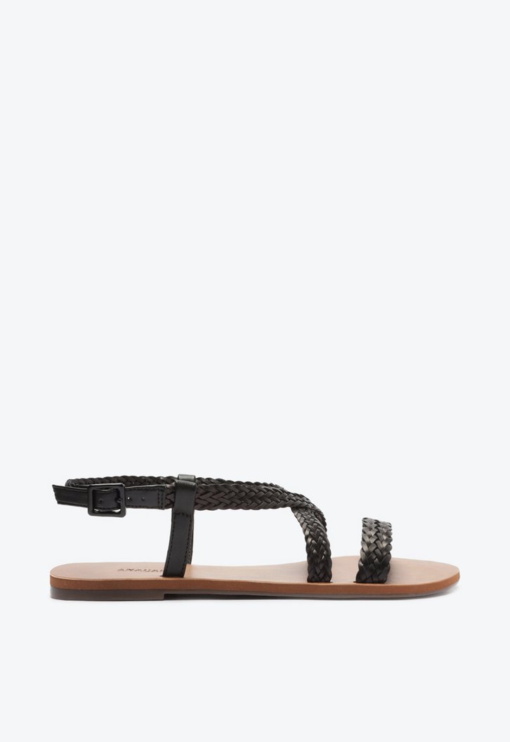 Sandália rasteira preta. O modelo tem sola flat e bico redondo. Traz tira trançada sobre os dedos e duas tiras trançadas que se cruzam no peito do pé e contornam o calcanhar com fecho em fivela metálica lateral. Possui ainda tiras lisas de suporte nas laterais. Com palmilha lisa marrom e inscrição Anacapri.