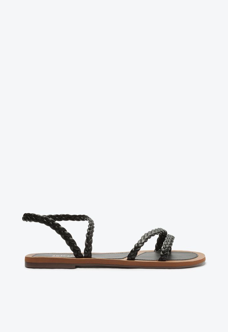 Sandália rasteira preta. O modelo tem sola flat e bico redondo. Traz duas tiras finas trançadas sobre os dedos e mais uma tira trançada que sai da lateral e contorna o tornozelo. Com palmilha recortada no centro e da cor do modelo com inscrição Anacapri.