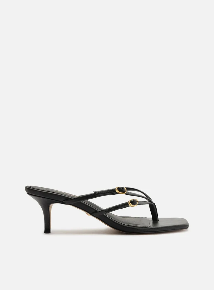 Sandália preta de couro. O sapato tem salto médio fino e formato quadrado na ponta. Traz tiras finas dividindo os dedos e com fivelas nas laterais. Com palmilha da cor do calçado e inscrição do nome da marca.