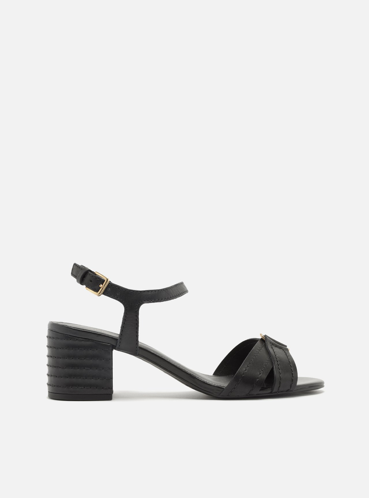 Sandália feminina preta em couro. O sapato tem salto médio bloco, revestido em couro e com costuras, e formato arredondado na ponta. Traz tiras médias em X e com detalhe metálico sobre os dedos. Possui tira em torno do tornozelo que fecha em fivela lateral. Com palmilha da cor da sandália e inscrição do nome da marca.