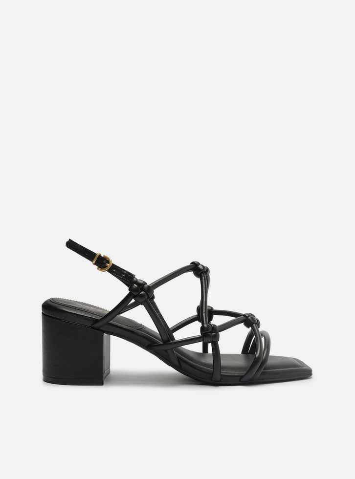 Sandália preta. O modelo tem salto médio bloco e bico quadrado. Traz tiras finas sobre os dedos, todo o peito do pé e nas laterais, unidas por nós. Com fecho em tira em torno do calcanhar e fivela metálica lateral. A sandália é aberta e exibe todo o pé.
