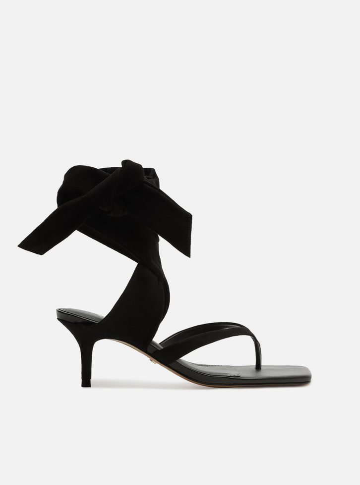 Sandália feminina preta em couro acamurçado. O sapato tem salto médio fino e formato quadrado na ponta. Possui tiras finas que dividem os dedos. Traz tiras largas que saem das laterais, cruzam no tornozelo, envolvem a perna e finalizam em laço. Com palmilha lisa da cor da sandália e inscrição do nome da marca.