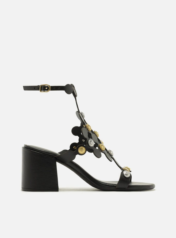 Sandália feminina preta de couro. O sapato tem salto médio bloco e formato arredondado na ponta. Traz tira sobre os dedos e estrutura em couro formada por peças redondas recortadas, na parte superior do pé, com aplicações metálicas. Possui tira fina, conectada ao cabedal, que contorna o tornozelo e fecha em fivela metálica. Com palmilha da cor da sandália e inscrição do nome da marca
