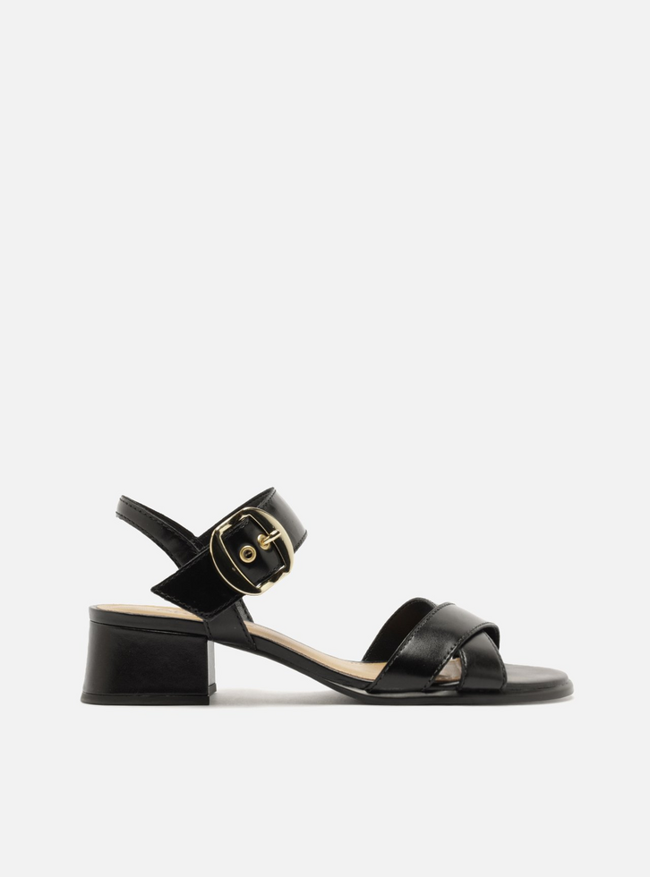 Sandália feminina preta de couro. O sapato tem salto baixo bloco e formato arredondado na ponta. Possui duas tiras médias cruzadas sobre os dedos com fivela metálica dourada. Traz tira fina no calcanhar e tira larga no tornozelo, com fechamento por fivela metálica grande. Com palmilha bege e inscrição do nome da marca.