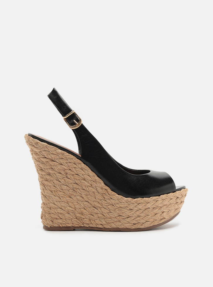 Sandália feminina preta de couro. O sapato tem salto alto plataforma, revestido em corda trançada, e formato arredondado na ponta. Aberta atrás, possui recorte arredondado no cabedal e ponteira aberta. Possui tira larga contínua ao cabedal, que segue pelas laterais, contorna o calcanhar e fecha em fivela metálica. Com palmilha da cor da sandália e inscrição do nome da marca.