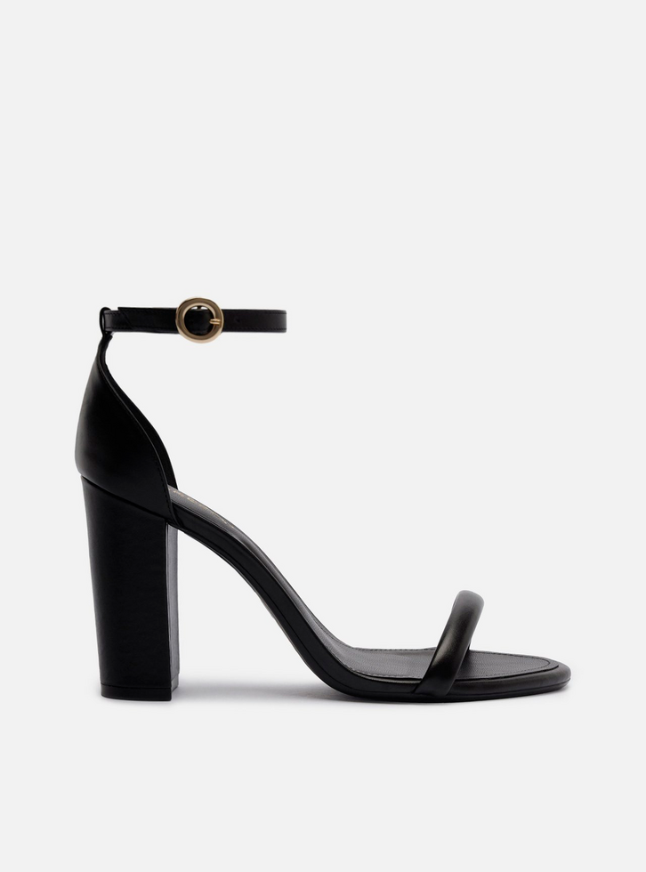 Sandália feminina preta em couro. O sapato tem salto alto bloco e formato arredondado na ponta. Traz tira fina sobre os dedos. Fechada no calcanhar, possui tira fina no tornozelo com fivela metálica lateral. Com palmilha da cor da sandália e inscrição do nome da marca.