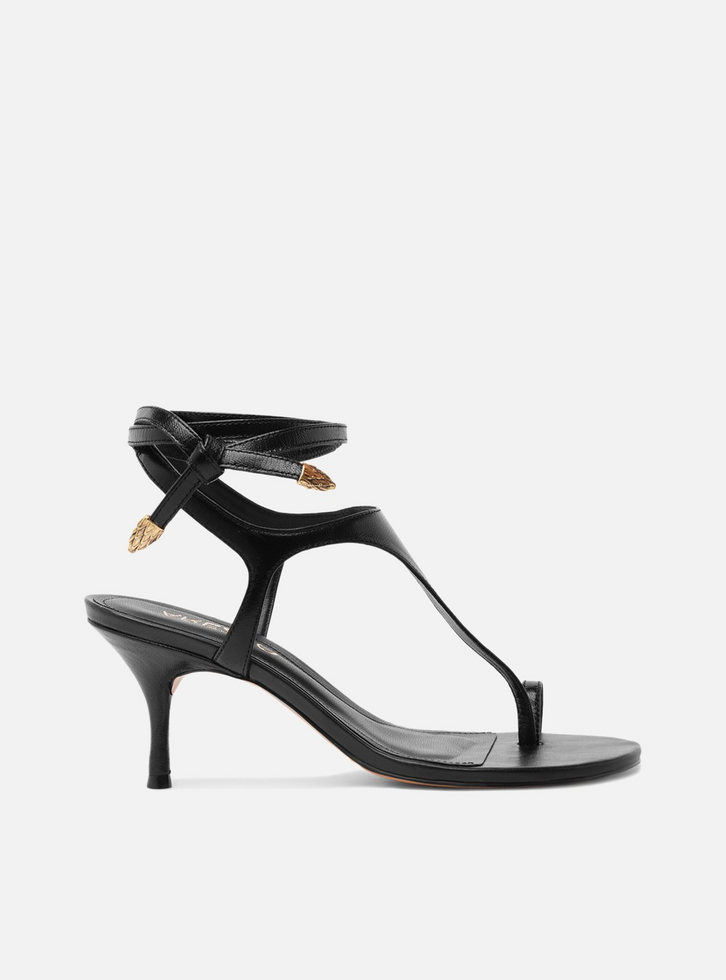 Sandália feminina preta de couro. O sapato tem salto médio fino e formato arredondado na ponta. Traz tira dividindo os dedos, que cobre parcialmente a parte superior do pé, e tira em torno do dedão. Possui tiras finas com ponteiras metálicas, conectadas à tira frontal, que contornam o tornozelo e fecham em amarração. Com palmilha da cor da sandália e inscrição do nome da marca.