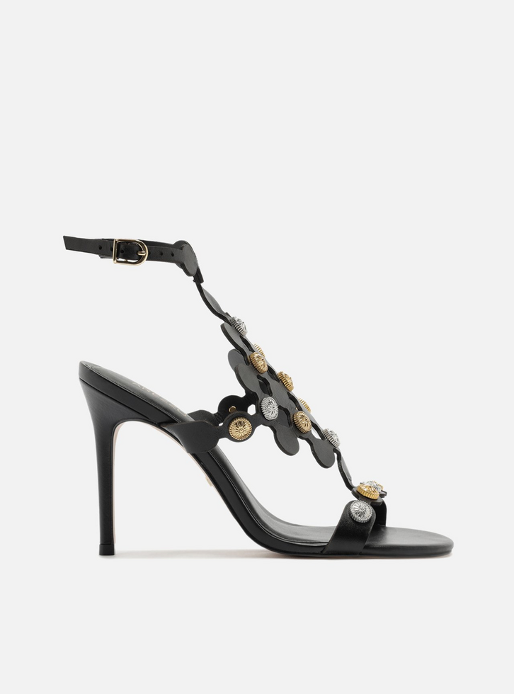 Sandália feminina preta de couro. O sapato tem salto alto fino e formato arredondado na ponta. Traz tira sobre os dedos e estrutura em couro formada por peças redondas recortadas, na parte superior do pé, com aplicações metálicas. Possui tira fina, conectada ao cabedal, que contorna o tornozelo e fecha em fivela metálica. Com palmilha da cor da sandália e inscrição do nome da marca.