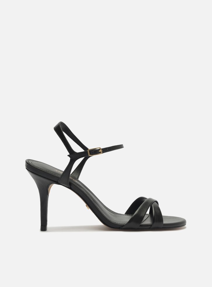 Sandália feminina de couro rosa. O sapato tem salto médio fino e formato arredondado na ponta. Traz tiras cruzadas sobre os dedos. Traz tira fina no tornozelo com fivela metálica lateral. Com palmilha na cor do restante do produto e inscrição do nome da marca.
