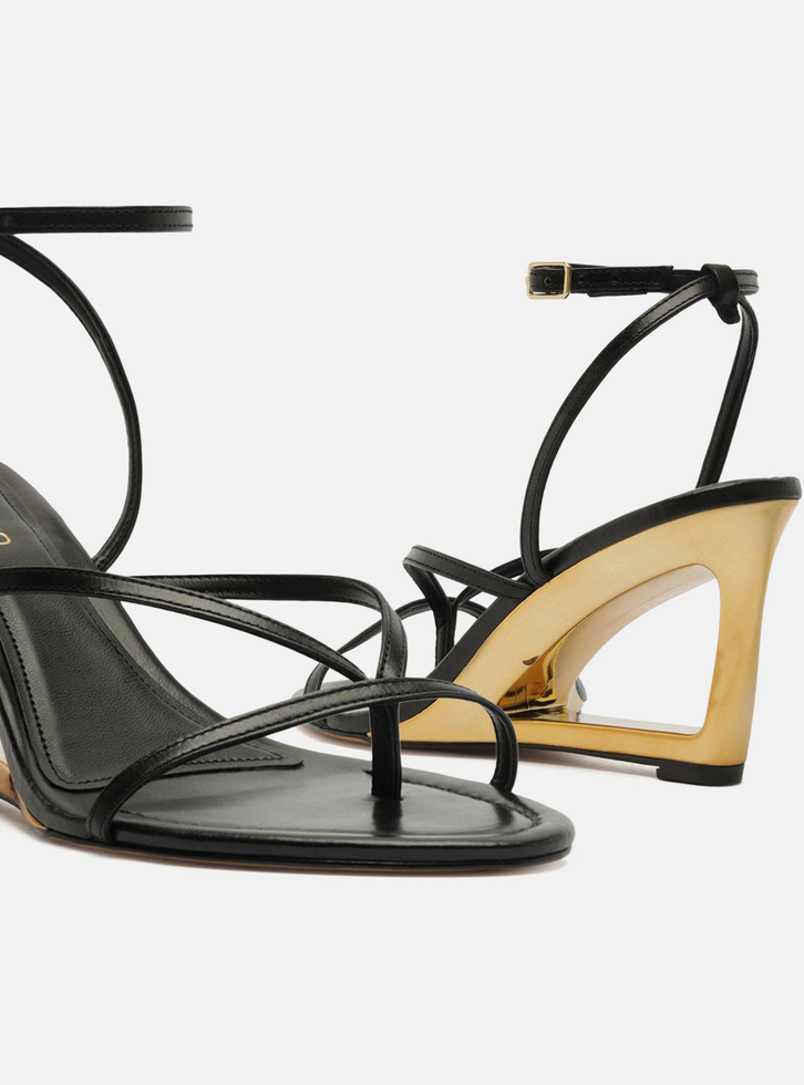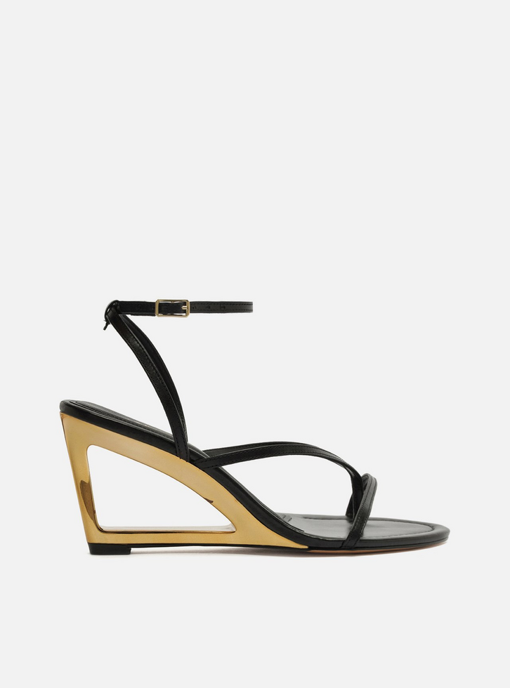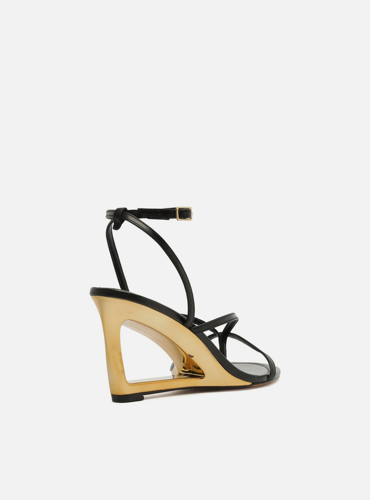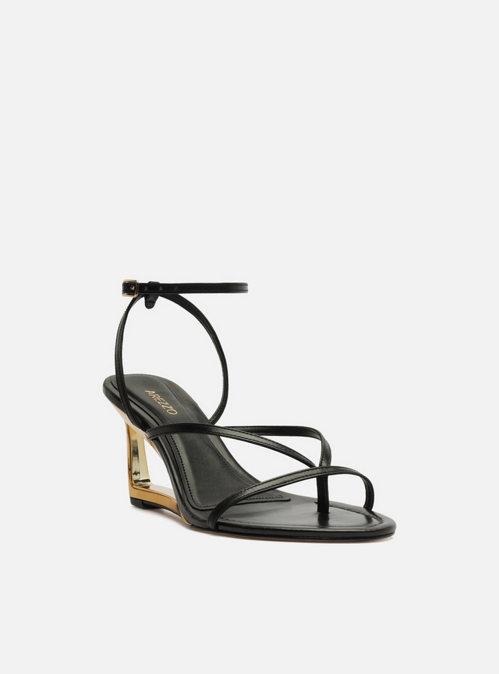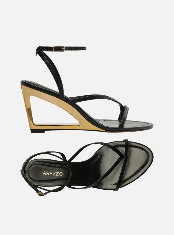 Sandália preta de couro. O sapato tem salto alto, em forma de anabela vazado e em metal dourado, e formato arredondado na ponta. Traz tiras finas dividindo e sobre os dedos. Possui tira fina que sai das laterais, se cruza no calcanhar, contorna o tornozelo e fecha em fivela lateral. Com palmilha da cor do calçado e inscrição do nome da marca. A sandália exibe todo o pé.