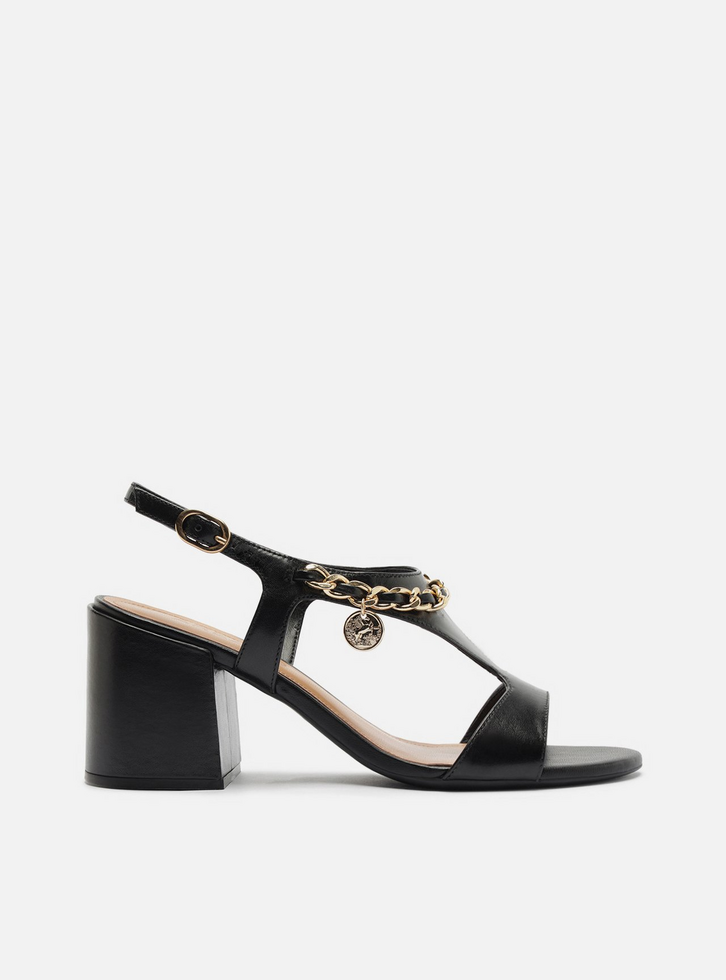 Sandália feminina preta de couro. O sapato tem salto médio bloco e formato arredondado na ponta. Possui tira sobre os dedos conectada à tira central, que alarga na parte superior do pé, contorna o calcanhar e fecha em fivela metálica lateral. Traz aplicação de corrente metálica dourada e detalhe de charm vazado em formato de medalha. Com palmilha bege e inscrição do nome da marca.