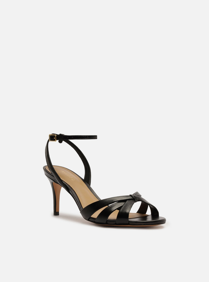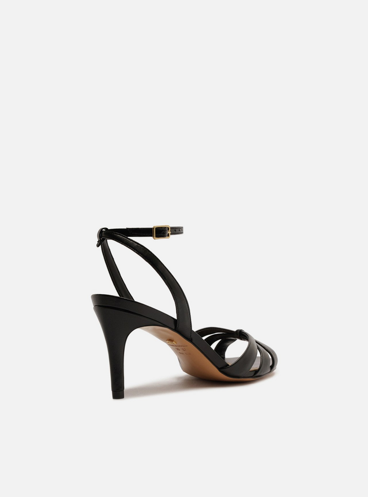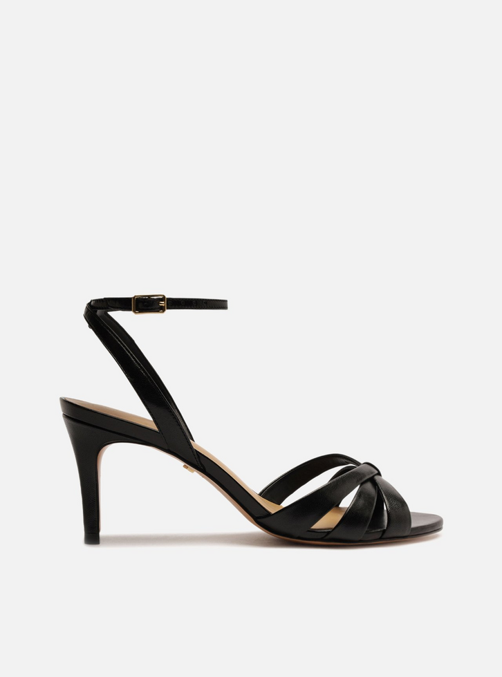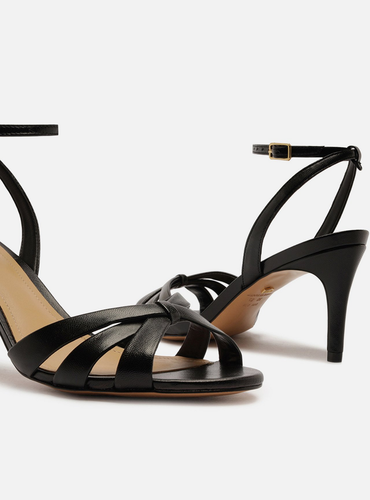 Sandália feminina preta em couro. O sapato tem salto médio fino e formato arredondado na ponta. Traz tiras finas cruzadas sobre os dedos. Possui tira fina que sai das laterais, cruza no calcanhar, contorna o tornozelo e fecha em fivela lateral. Com palmilha bege e inscrição do nome da marca. A sandália exibe todo o pé.
