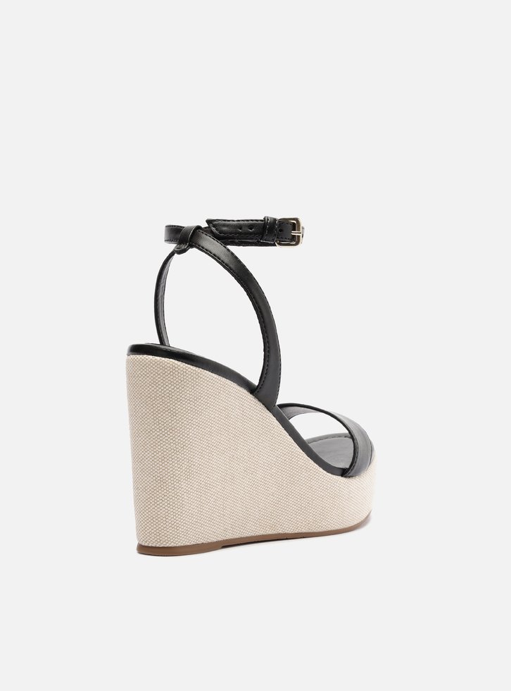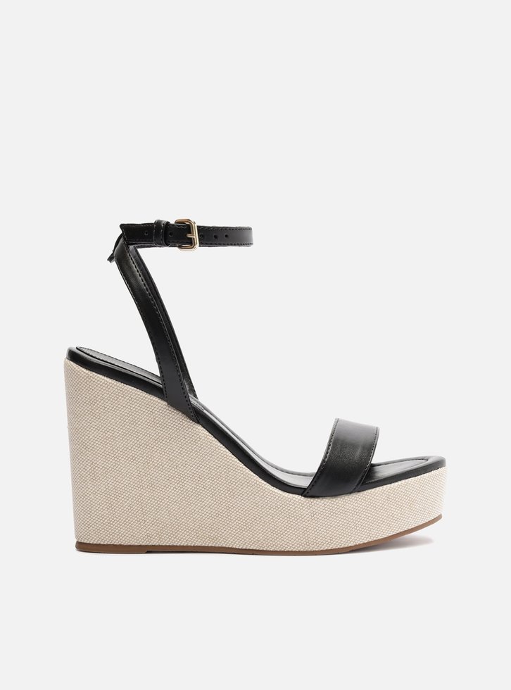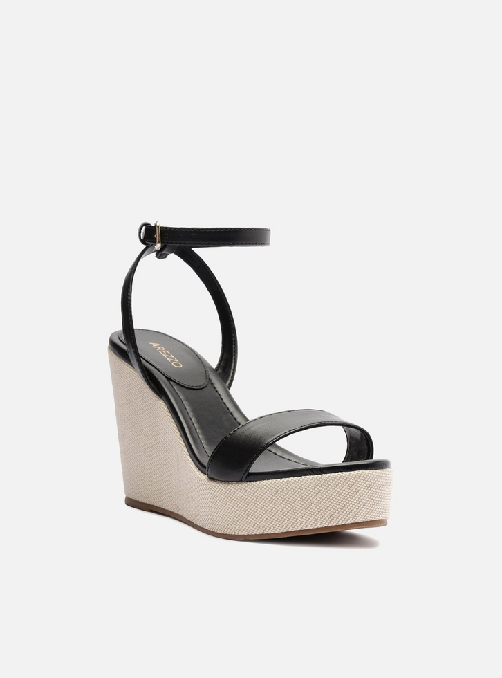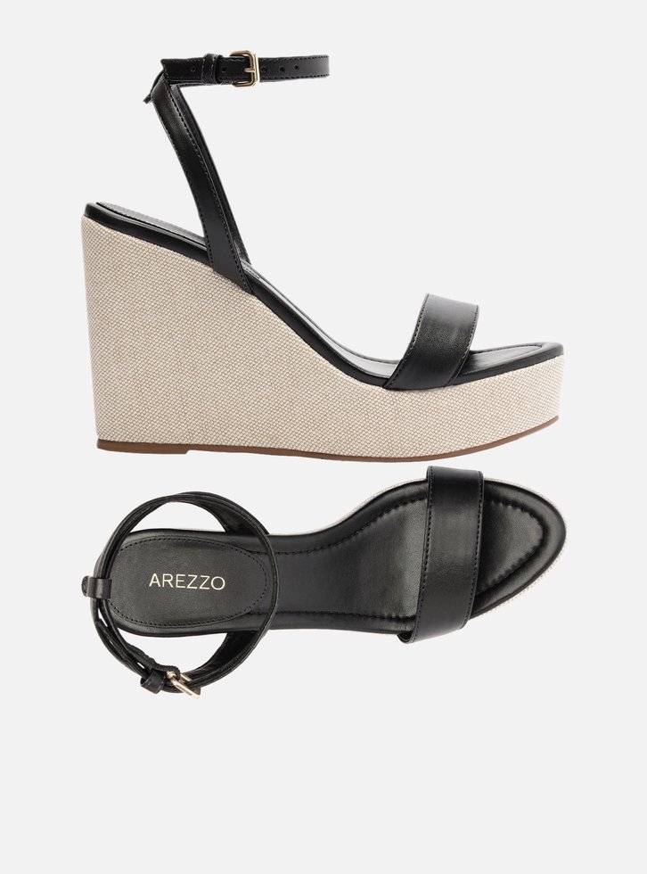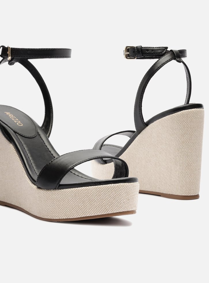 Sandália preta. O modelo tem salto alto plataforma, revestido em linho, e bico redondo. Traz tira média sobre os dedos. Aberta, possui tira fina que sai das laterais, se cruza no calcanhar, contorna o tornozelo e fecha em fivela metálica lateral. Com palmilha da cor do modelo e inscrição do nome da marca. A sandália exibe todo o pé.