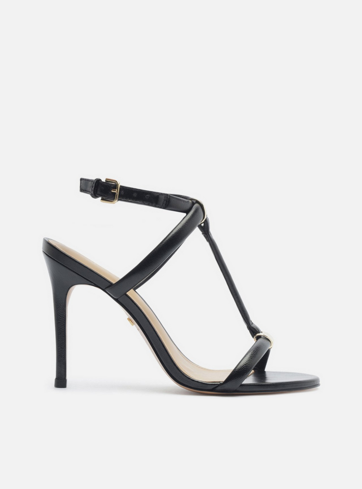 Sandália feminina preta. O sapato tem salto alto fino e formato arredondado na ponta. Traz tira sobre os dedos e tira vertical na parte superior do pé, que vai até o tornozelo e se conecta a outras duas tiras — uma delas contorna o tornozelo e fecha em fivela lateral. As tiras são levemente estofadas e conectadas por elos metálicos. Com palmilha bege e inscrição do nome da marca.