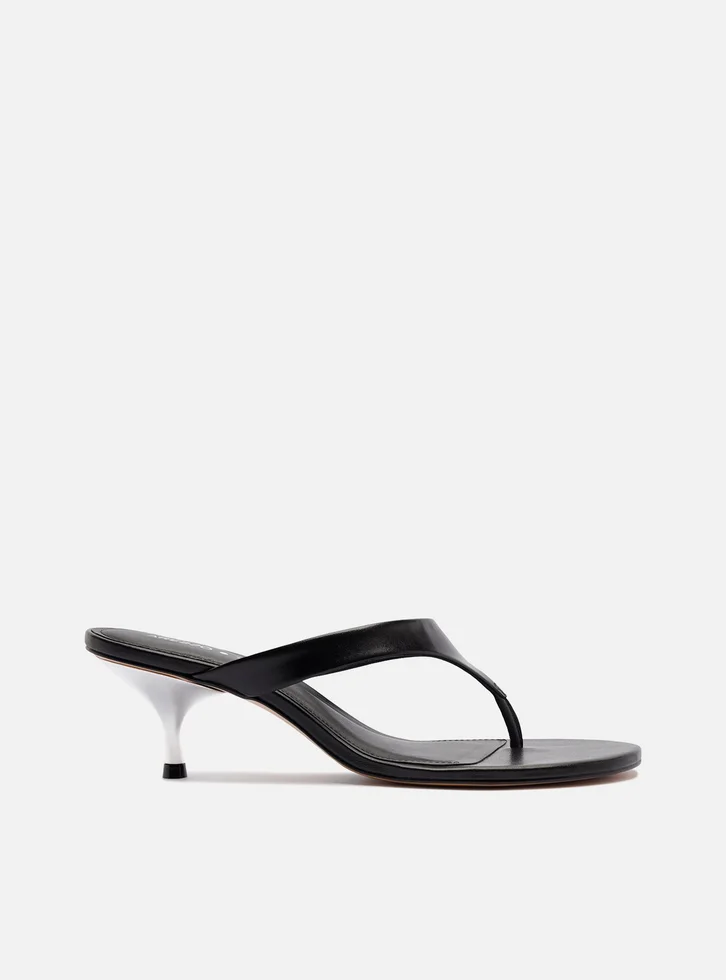 Sandália feminina preta. O sapato tem salto baixo fino prata e formato arredondado na ponta. Traz tira larga dividindo os dedos, em formato triangular. Com palmilha da cor da sandália, contorno em pesponto e inscrição Arezzo + TIG.