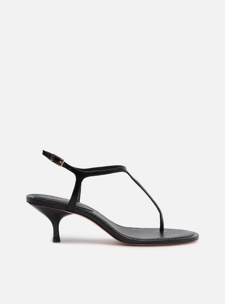 Sandália feminina preta. O sapato tem salto baixo fino e formato arredondado na ponta. Traz tira fina dividindo os dedos e tira afivelada em torno do tornozelo. Com palmilha da cor da sandália e inscrição do nome da marca.