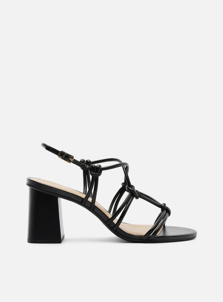 Sandália feminina preta. O sapato tem salto médio bloco quadrado e formato arredondado na ponta. Traz tiras finas sobre os dedos e na parte superior do pé, unidas por nós decorativos. Possui tira fina no tornozelo com fecho em fivela metálica lateral. Com palmilha bege e inscrição do nome da marca.