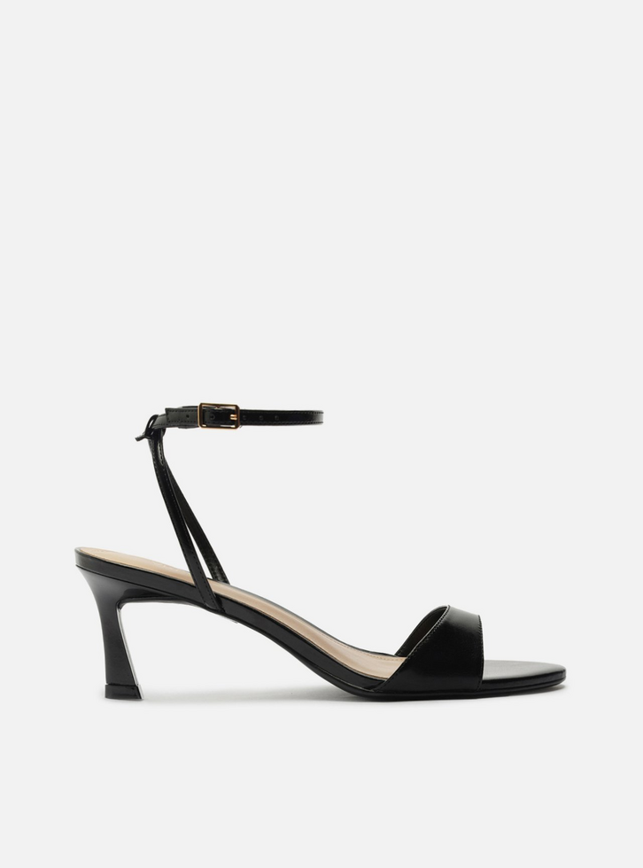 Sandália feminina preta. O sapato tem salto médio fino e formato arredondado na ponta. Traz tira média sobre os dedos. Possui tiras finas que saem das laterais, cruzam no calcanhar, contornam o tornozelo e fecham em fivela lateral. Com palmilha bege e inscrição do nome da marca.
